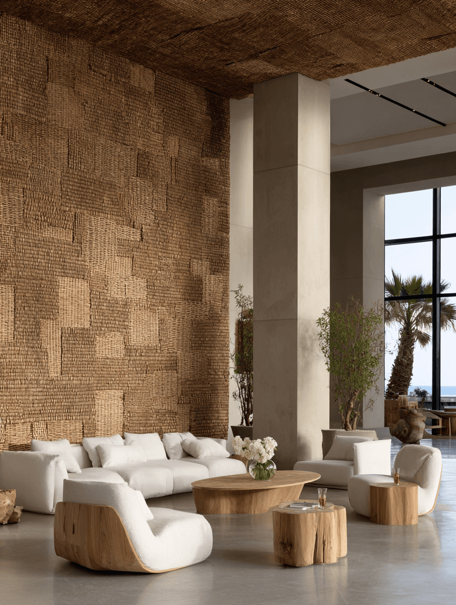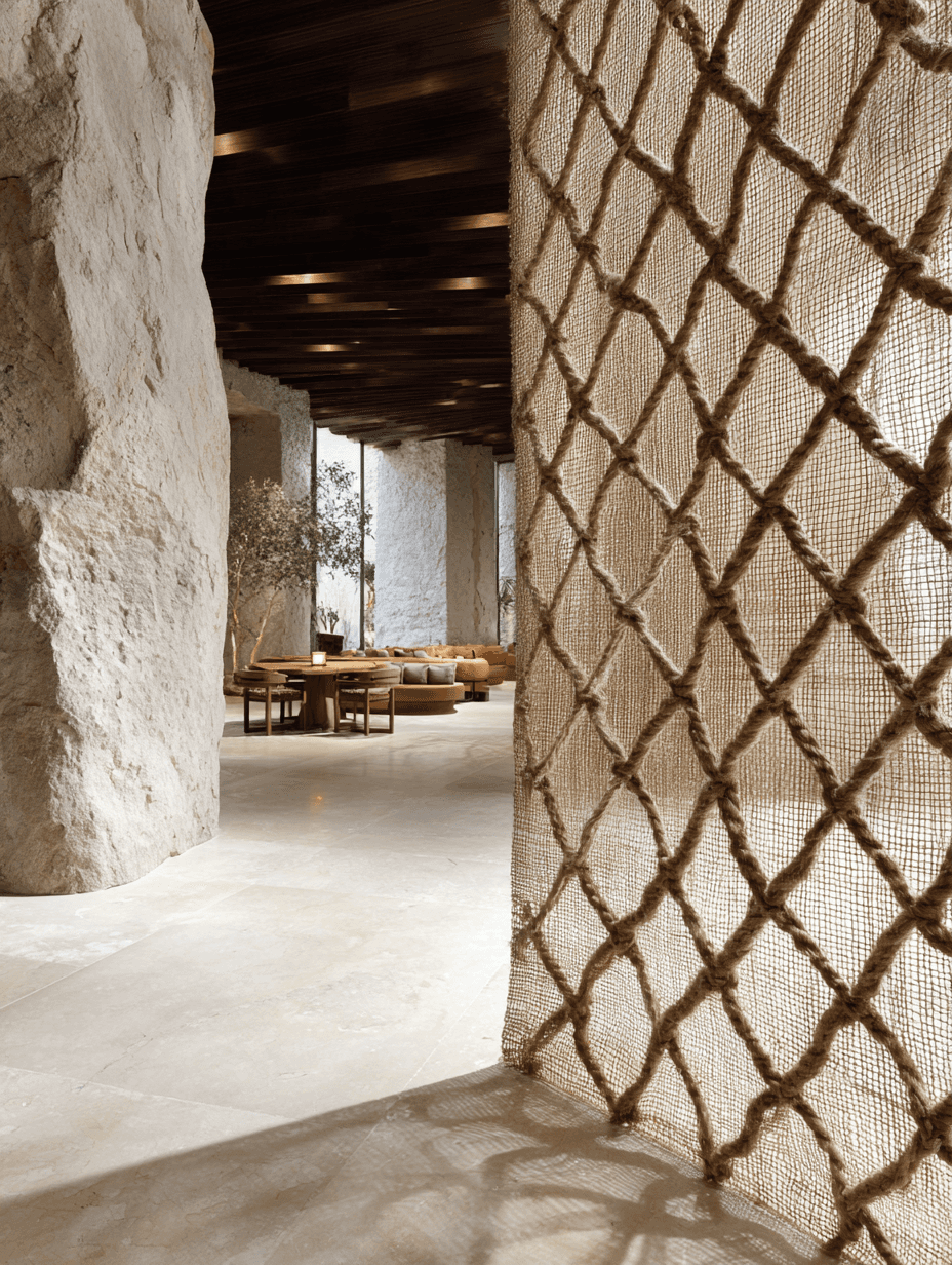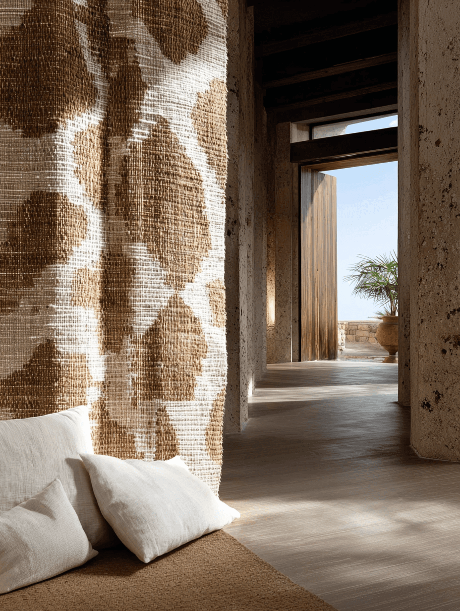 Farida Nour is a Fès-based textile artist whose practice draws on the geometric weaving traditions of the Atlas region. ROCA commissioned her to develop a series of hand-loomed wall panels for the communal spaces across all four residences. Each panel is site-specific, scaled to its wall, and woven in a palette pulled from the surrounding landscape.